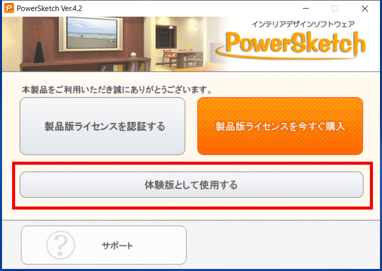 デスクトップのショートカットアイコンをダブルクリック、または「スタート」>「PowerSketch Ver.4.2」>「PowerSketch Ver.4.2」を選択します。
